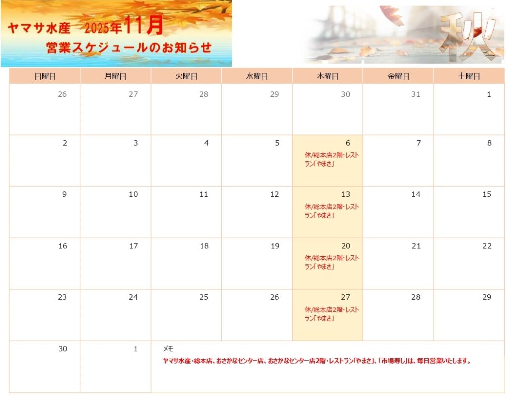 2025年11月の各店舗の営業スケジュールをお知らせします。